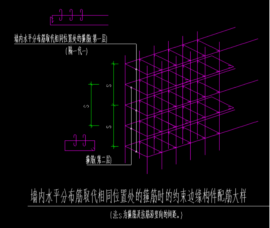 这里说明下,图集说的墙身水平筋与暗柱箍筋间距不同的时候就像隔一步一,一个箍筋是暗柱本身箍筋,一个箍筋是墙身水平筋(如图)