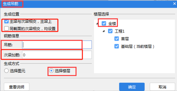 方法三:使用【生成吊筋】功能,生成时不输入吊筋/次梁加筋信息,【生成方式】点击“选择楼层”,勾选全部楼层,点击确定即可将吊筋/次梁加筋全部清空。如图: