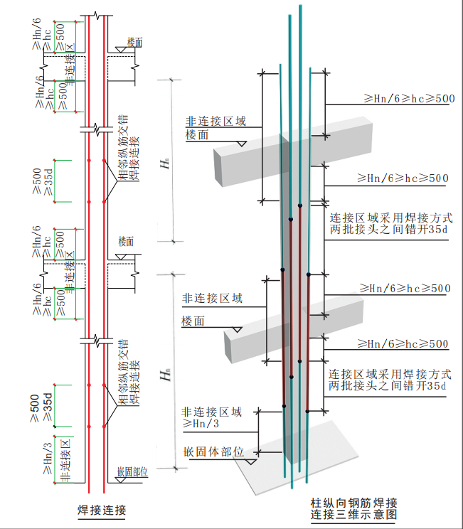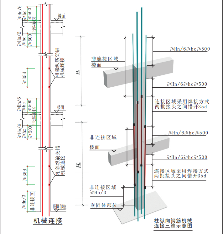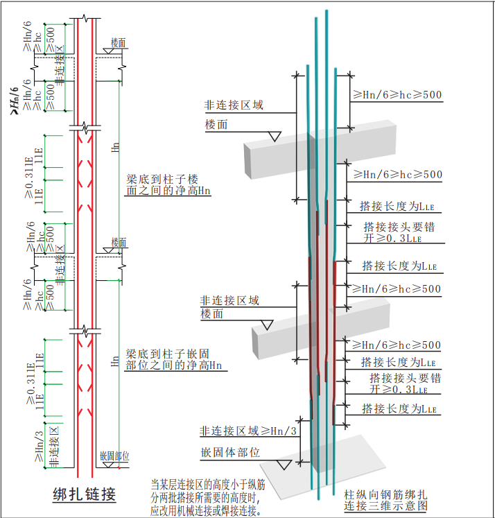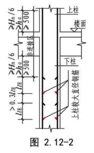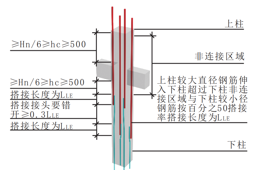第二种情况:上层柱钢筋直径比下层钢筋直径大的情况,且根数相同的情况下,上层较大直径的钢筋应在下层采用机械或搭接连接,且应在箍筋加密区外搭接,接头百分率不大于50%(柱箍筋加密区大家都明白吧,三者取最大值,那三者呢?500、hc,hn/6)