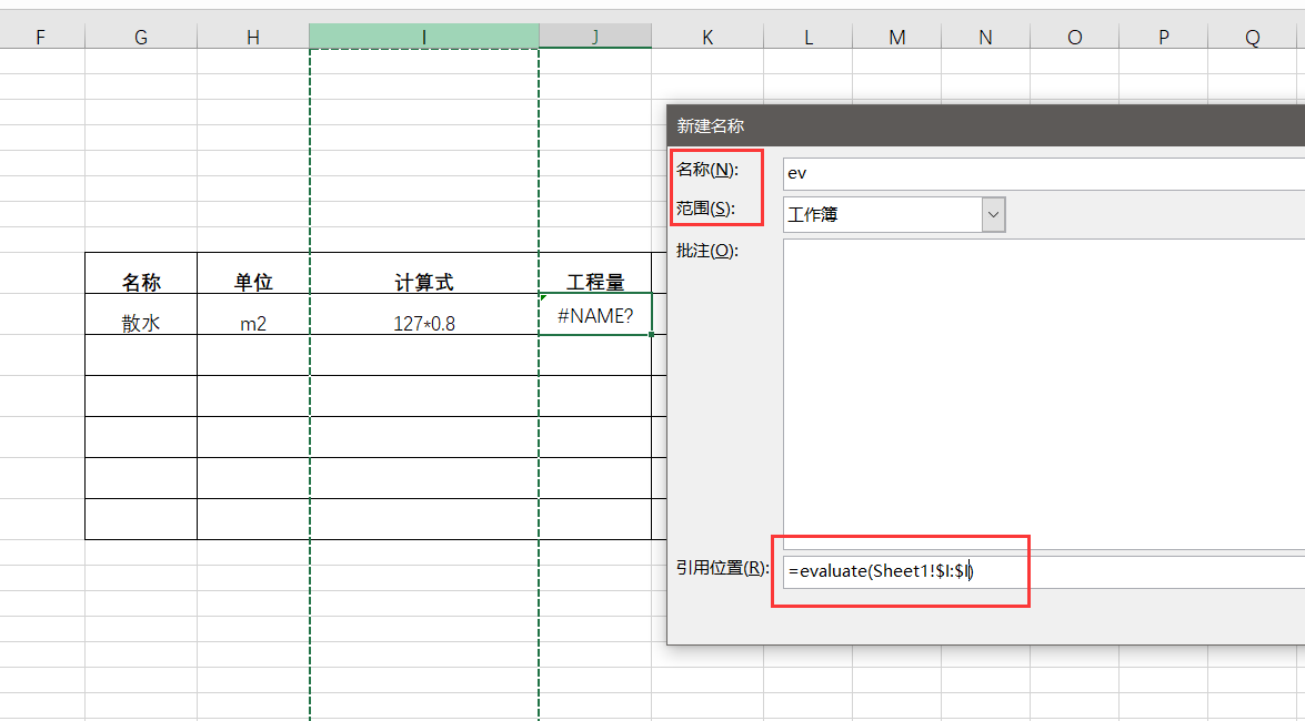名称:可以随便输入,这里我输入的是ev范围:可以选择这个工作表也可以选择这个工作表以外的其他工作表引用位置:输入一个=然后括号选择计算式列然后确定就行了