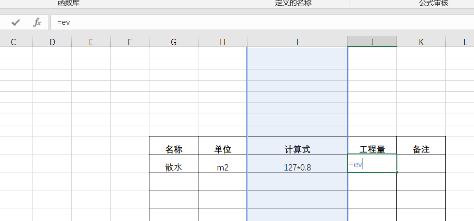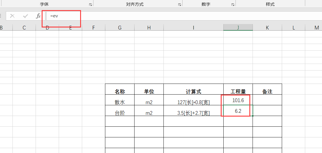 然后我们回到计算界面,在工程量位置输入一个=ev,就会得到计算结果