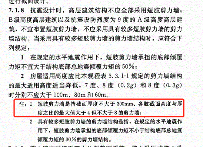 “短肢剪力墙是指截面厚度不大于300mm,各肢界面高度与厚度之比的最大值大于4但不大于8的剪力墙”