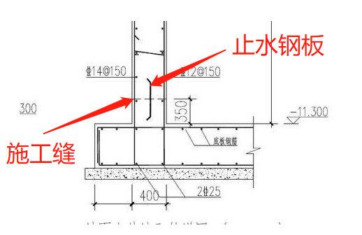 上图是筏板加剪力墙,剪力墙里面有个竖向的黑色的东西就是止水钢板,而横着的就是搞施工的人留设的施工缝,为什么要留设,其实一般施工条件允许,尽量底板就和墙体一起浇筑了,不需要留置施工缝。但施工面积较大,工程量较大,结构复杂的情况下,就需要底板与墙板分开浇筑,留置施工缝。我就不说止水钢板留设的朝向了,不影响工程量,不过也能告诉大家止水钢板一般朝向是迎水面。
