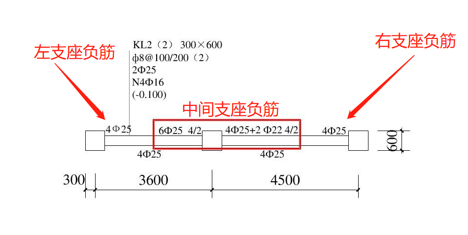 这种一般称呼为支座负筋,一根梁,左右两侧加中间就形成了左右支座负筋+中间支座负筋,在平法表示就是(如图五)