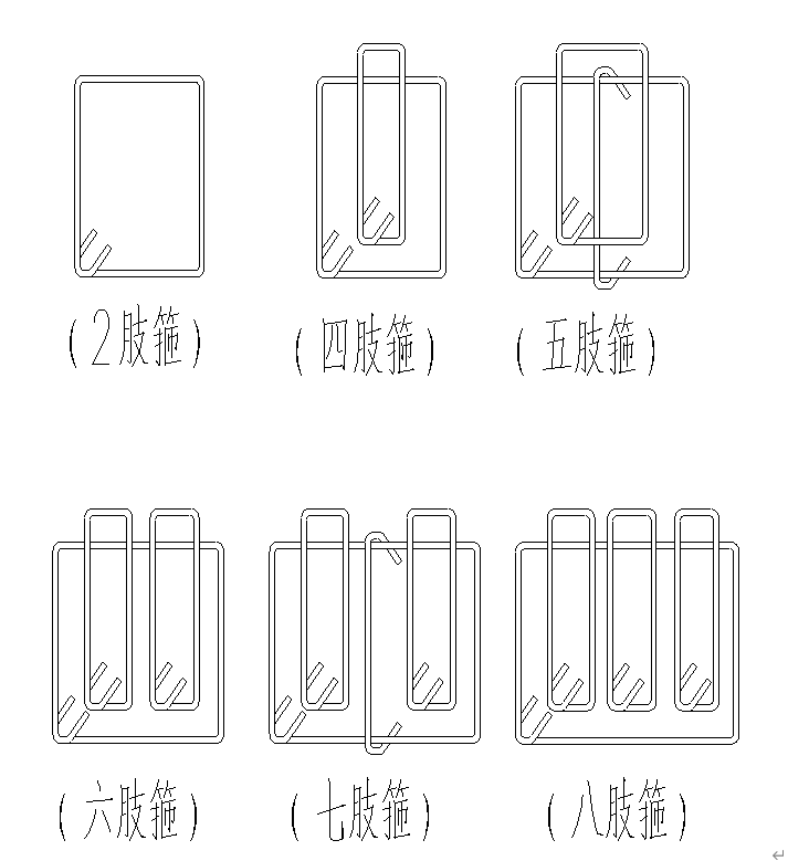 通俗的讲,箍筋肢数就是你假设把梁沿着横向截开得到的横截面上可以看到的在竖直方向的钢筋的根数,不管是由几根钢筋弯成的,有一个竖直的钢筋就算一肢 (如图)