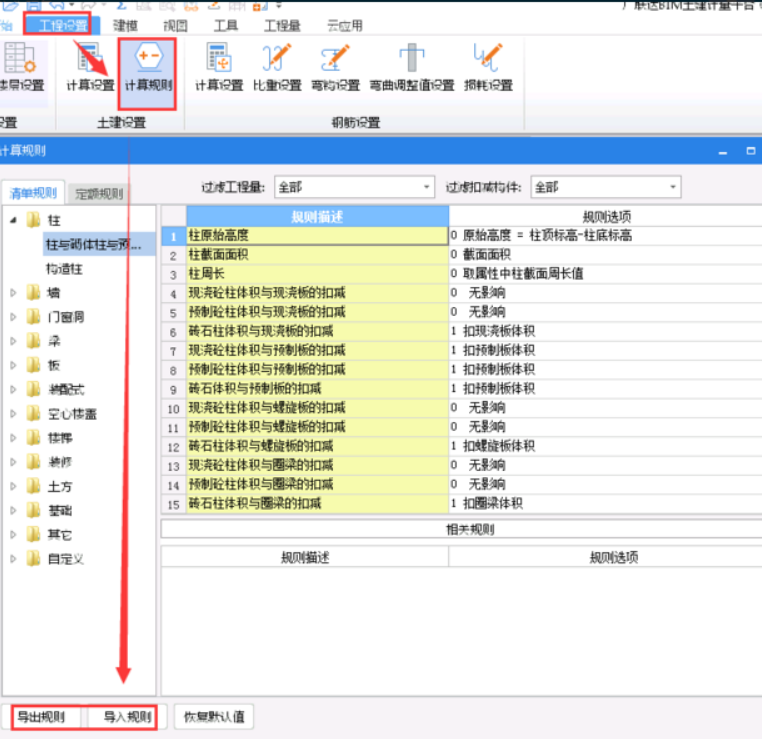 工程设置---土建设置---计算规则,左下角导入规则/导出规则即可。如图: