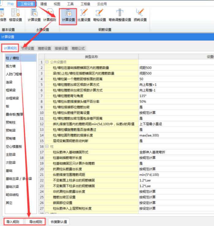 钢筋计算设置导入导出:工程设置---钢筋设置---计算设置---计算规则/节点设置/箍筋设置/搭接设置/箍筋公式,左下角---【导入规则】/【导出规则】即可。