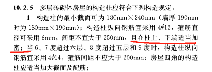 问题:构造柱上下端的箍筋是否加密?解决办法:这个问题我也查了很久的资料,首先我查到的是GB50003-2011砌体结构设计规范,在10.2.5条说明明确了多层砌体房屋的构造柱要求,上下端适当加密。这里的适当没有具体范围。且没有说明框架结构。