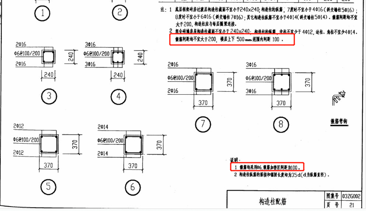 然后我又在GB50011-2010建筑抗震设计规范第7.3.2条说明中查阅到 这个规范也是说明了多层砖砌房屋构造柱上下两端适当加密,没有明确框架结构的构造柱是否需要两端加密,那么框架结构的构造柱到底需不需要加密?规范查完了我开始查图集。 平法图集没有,我就查询了西南15G701砌体图集及12J614-1砌体图集。 在12G614-1图集上是可以看出来间距变化,但是细看的时候发现是在连接区段箍筋间距小了5公分而已。200的间距其实不应该算是加密。 然后我就继续查,终于在03ZG002民用多层砖房抗震构造图集中看到构造柱上下两端500范围内箍筋加密。 但是这也是砖混结构的构造柱,并不是框架结构的构造柱 所以我又没查到,直到我看到了下某个建筑图纸设计说明中的这句话 这里说明我为什么觉得框架结构的构造柱上下两端不需要加密 1、是因为规范及图集都没看到特别说明。 2、是在查阅资料的时候发现了王亚雄老师出版的《建筑抗震设计规范》,内容如下