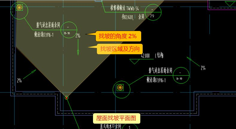 一般图纸的屋面的平面图纸,都会有类似这样的区域划分的找坡平面。或者在图纸做法里,注明找坡的做法,这些时候就需要根据图纸计算找坡的。