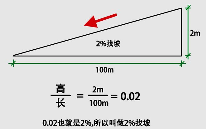 2%坡就是:从0高度开始,一直走到100m长度的地方,高度变成了2m,就叫2%找坡。