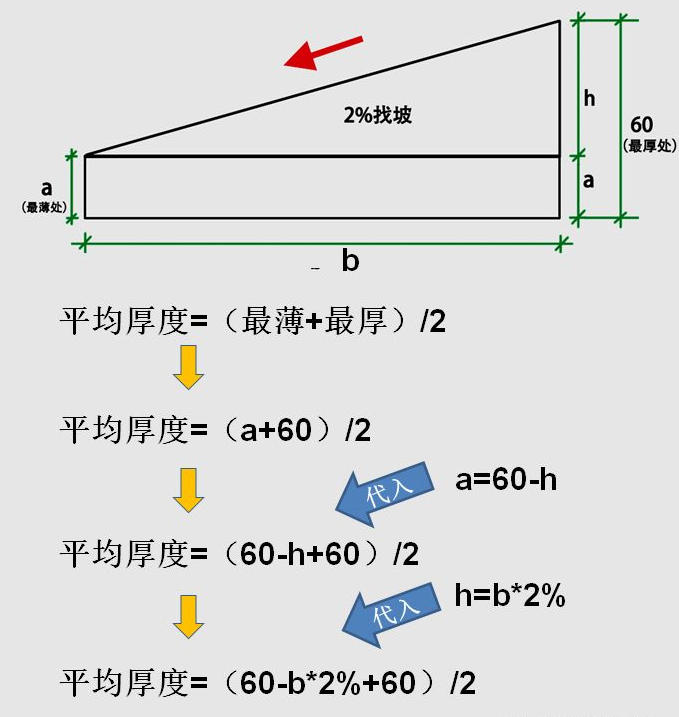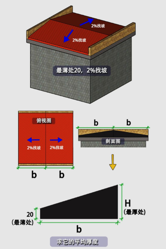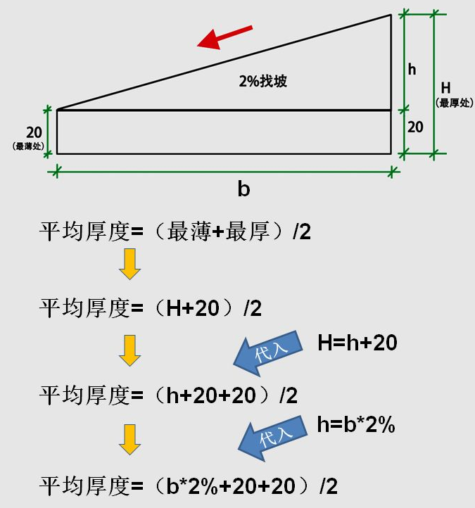 我们来拟定一个,最薄处20,2%找坡的最常见情况,来推理一下平均厚度的计算公式。