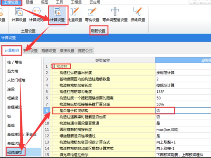 方法:在工程设置---钢筋设置---计算设置---计算规则---砌体结构---构造柱---【是否属于砖混结构】,【否】改为【是】---再汇总计算,如图:
