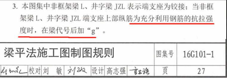 问题:结构梁配筋图中,集中标注的Lg是什么意思?解决办法:详平法16G101-1 27页有说明,表示充分利用钢筋抗拉强度时,在梁代号后加g