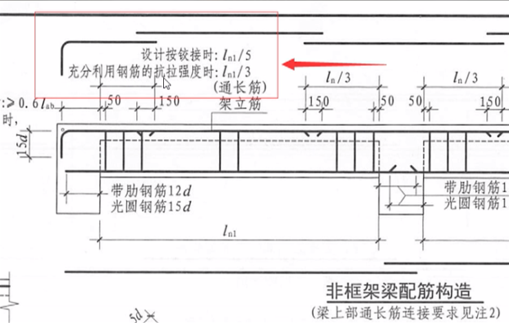 其节点构造也有所变化:充分利用钢筋的抗拉强度时其梁端部负筋长度为1/3