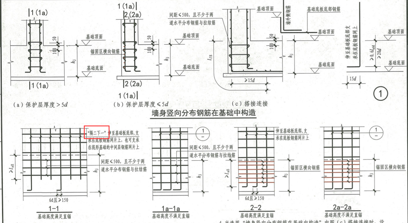问题:剪力墙纵筋在基础内如何锚固?解决办法:图集16G101-3第64页可知,分达到直锚和没有达到直锚,和暗柱在基础中锚固一样,这里稍微不同的点就是达到直锚只需要隔二下一,这里的隔二下一就是隔两根下一根伸入基础底部并锚固