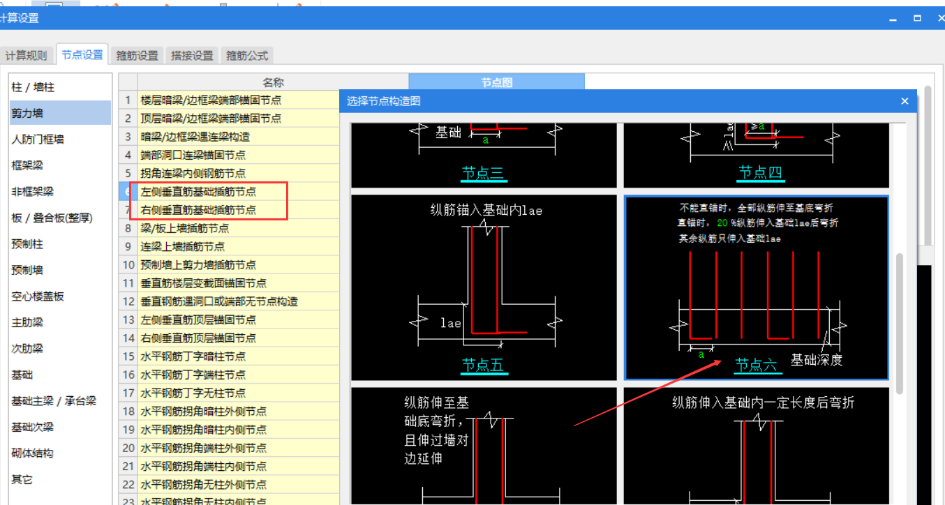 工程设置---计算设置---节点设置---剪力墙---左侧/右侧垂直筋基础插筋节点---选择节点六即可