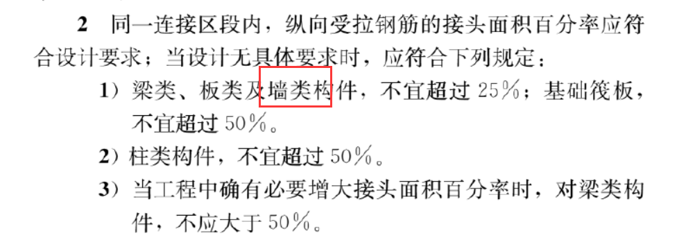 问题:墙类构件纵筋搭接率是25%还是50%还是100%?我看很多图纸说明写的都是不小于25%,所以都按照25%计算了。但是有的人设置的50%,也有设置100%的。