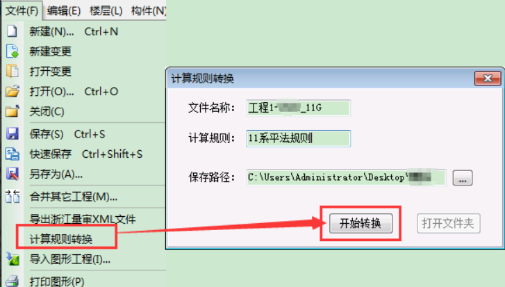 点击文件---【计算规则转换】---选择保存路径---【开始转换】,转换完成后会弹出确认窗 。