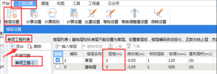 步骤一:工程设置---楼层设置---单项工程列表---添加单项工程,根据实际工程插入楼层,修改对应层高及底标高。