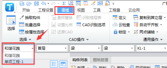 步骤三:设置好【单项工程】后,切换到【建模】界面,分别在不同的单项工程里面绘制图元即可。