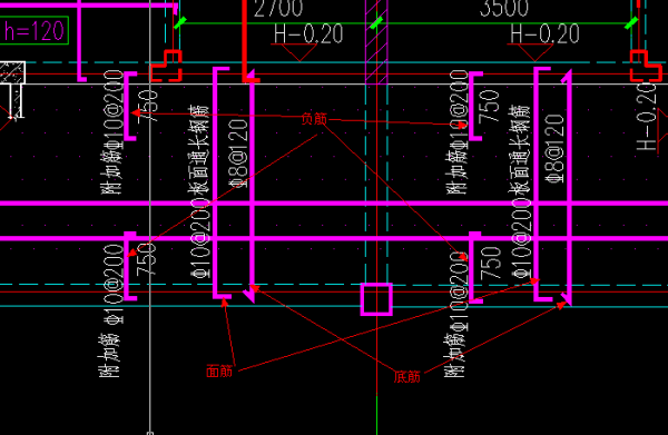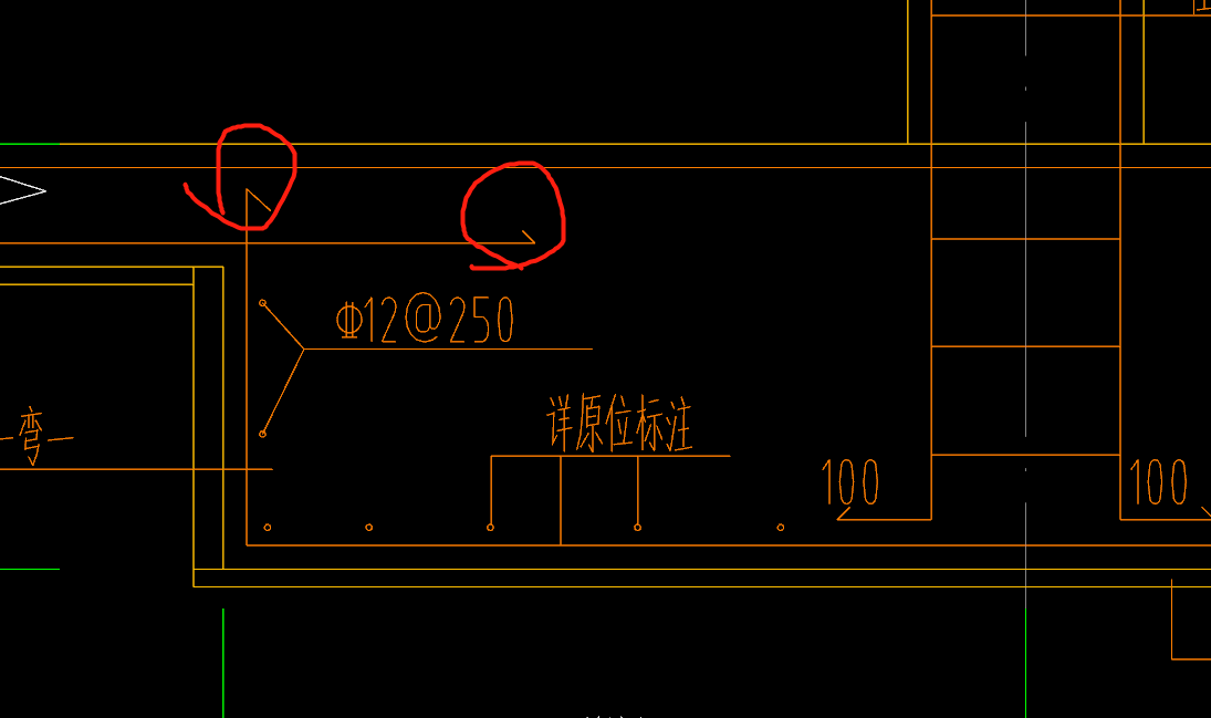 这样大家就明白了这个标识的意思了吧,其实板筋也是这种起止符号,因为板底筋一般都是直接伸进梁里面,没有弯钩,一般只有面筋才有(如下图)