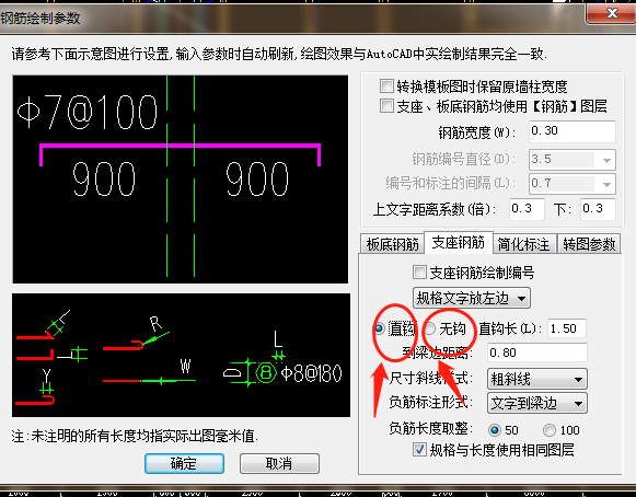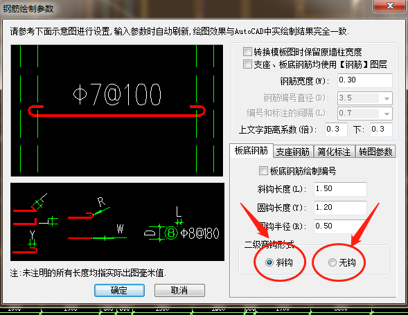 继续下面的讲解,下图就是用板王绘制板筋,可以看到的是圆钢都是有180°弯钩的。