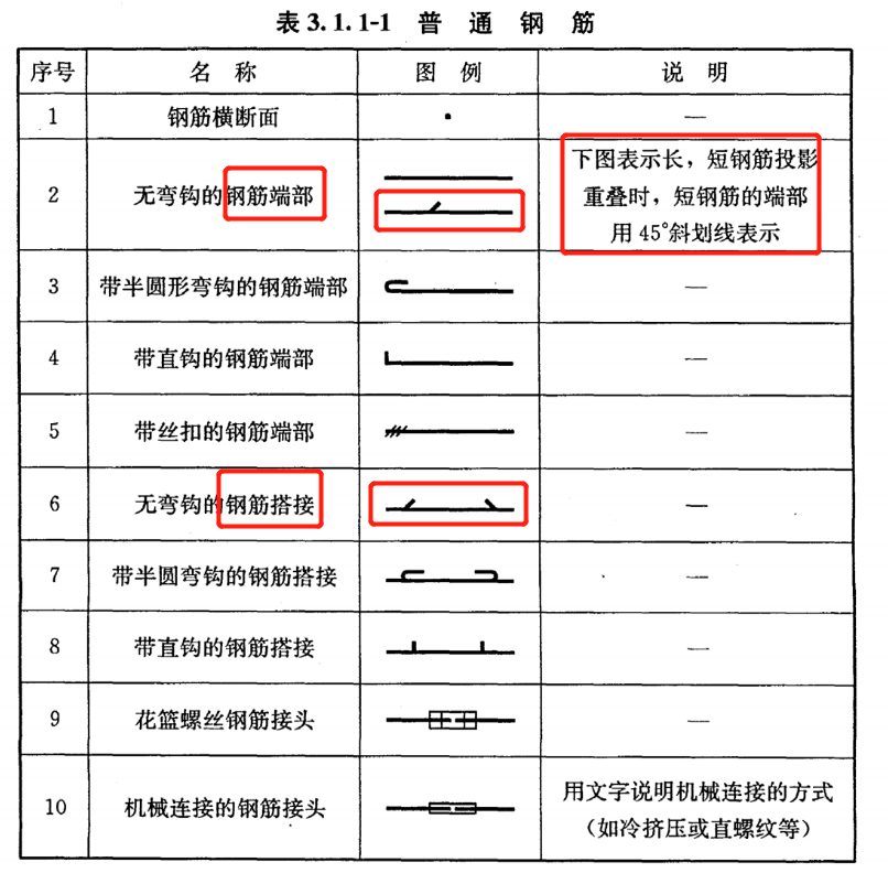 弯钩朝右和下的是面筋,弯钩朝左和上的是底筋 左上底右下面 还有一种直接画直线,直线的是底筋(PS:如果没有特别注明的话) 下面这张图还没讲完,大家看到序号6,注明无弯钩的钢筋搭接图例,是不是有两个起止符号