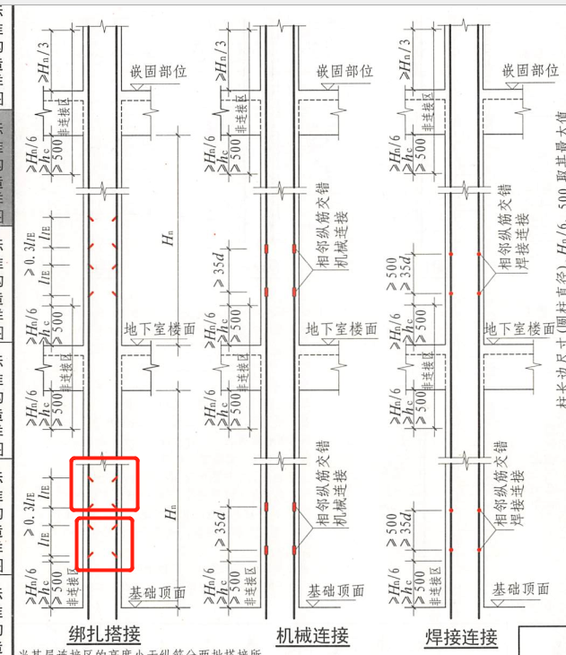 在我红色圈的位置上面每排两个、两排四个起止为搭接连接区段,下面每排两个、两排四个起止也为搭接区段,中间一个0.3lle的非连接区段,大家看明白了。然后机械连接和焊接连接符号也各不相同。