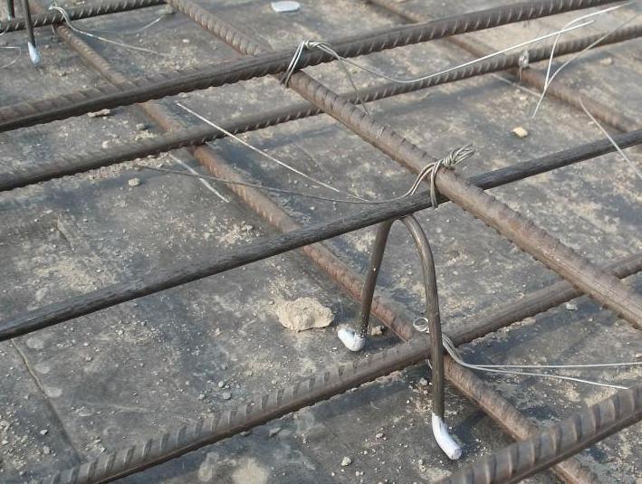 马凳,它的形状象凳子故俗称马凳,也称撑筋。用于上下两层板钢筋中间,起固定上层板钢筋的作用。当基础厚度较大时(大于800mm)不宜用马凳,而是用支架更稳定和牢固。马凳钢筋一般图纸上不注,只有个别设计者设计马凳,大都由项目工程师在施工组织设计中详细标明其规格、长度和间距,通常马凳的规格比板受力筋小一个级别,如板筋直径ф12可用直径为ф10的钢筋做马凳,当然也可与板筋相同。纵向和横向的间距一般为1米。不过具体问题还得具体对待,如果是双层双向的板筋为ф8,钢筋刚度较低,需要缩小马凳之间的距离,如间距为@800*800,如果是双层双向的板筋为ф6马凳间距则为@500*500。有的板钢筋规格较大,如采用直径ф14,那么马凳间距可适当放大。总之马凳设置的原则是固定牢上层钢筋网,能承受各种施工活动荷载,确保上层钢筋的保护层在规范规定的范围内。板厚很小时可不配置马凳,如小于100MM的板马凳的高度小于50mm,无法加工,可以用短钢筋头或其它材料代替。总而言之,马凳的设置要符合够用适度的原则,既能满足要求又要节约资源。