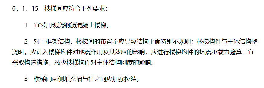 GB50011-2010第6.1.15条第2款:对于框架结构,楼梯间的布置不应导致结构平面特别不规则;楼梯构件与主体结构整浇时,应计入楼梯构件对地震作用及其效应的影响,应进行楼梯构件的抗震承载力验算;宜采取构造措施,减少楼梯构件对主体结构刚度的影响。