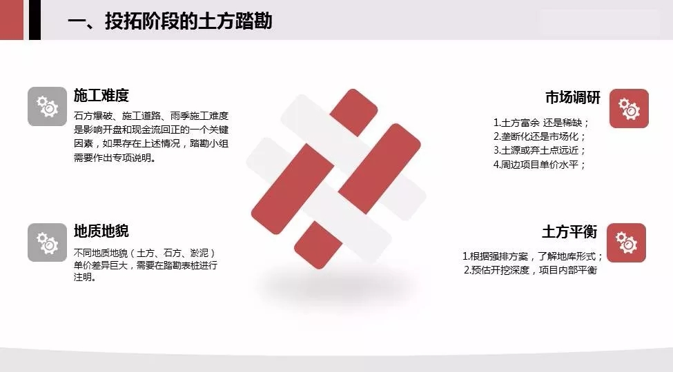 1.投拓前的土方踏勘:施工难度,地质地貌,市场调研,土方平衡,应有个大致的判断;