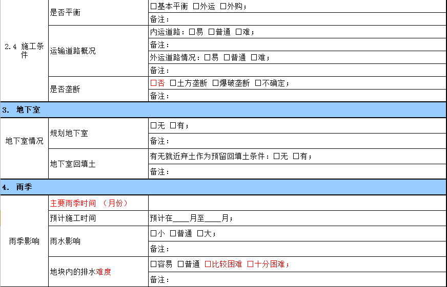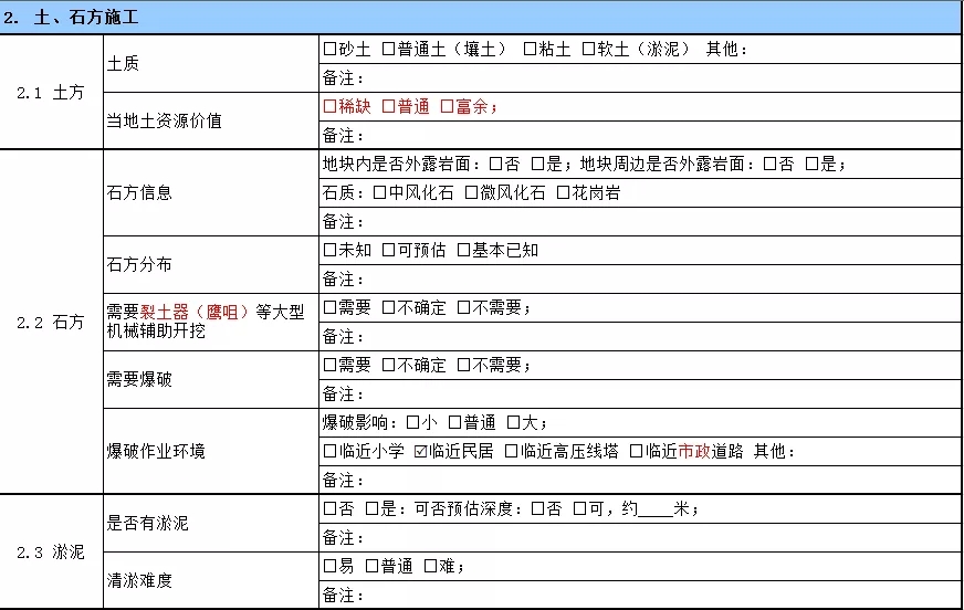 投资拓展小组人员只需要根据踏勘清单一一完成相关要素的调研,避免人为经验,缺漏相关调研因素,某标杆企业的土方踏勘清单样表如下:
