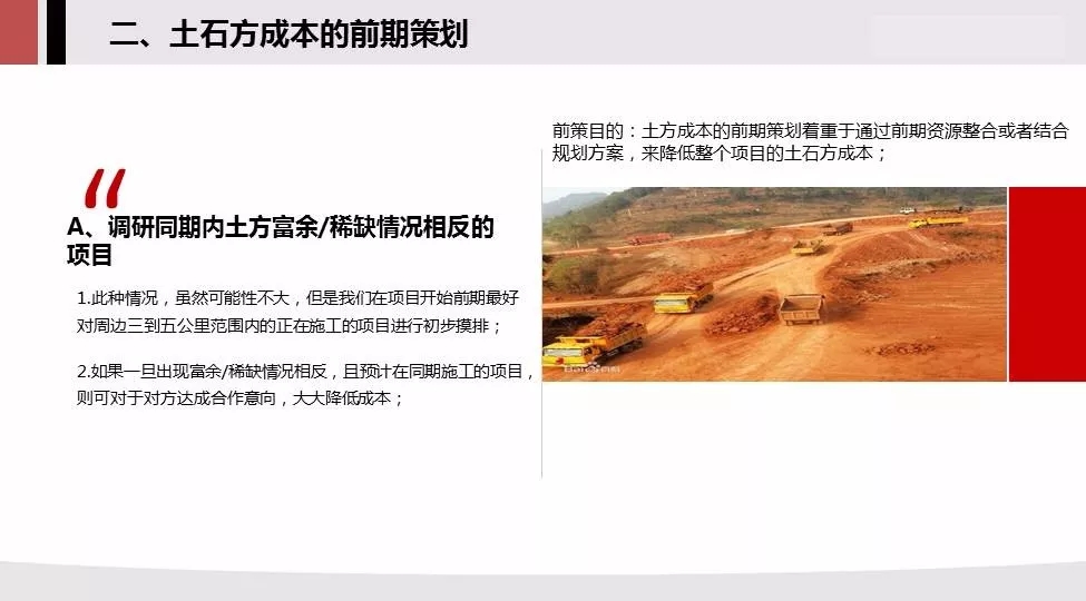 前策目的:土方成本的前期策划着重于通过前期资源整合或者结合规划方案,来降低整个项目的土石方成本;