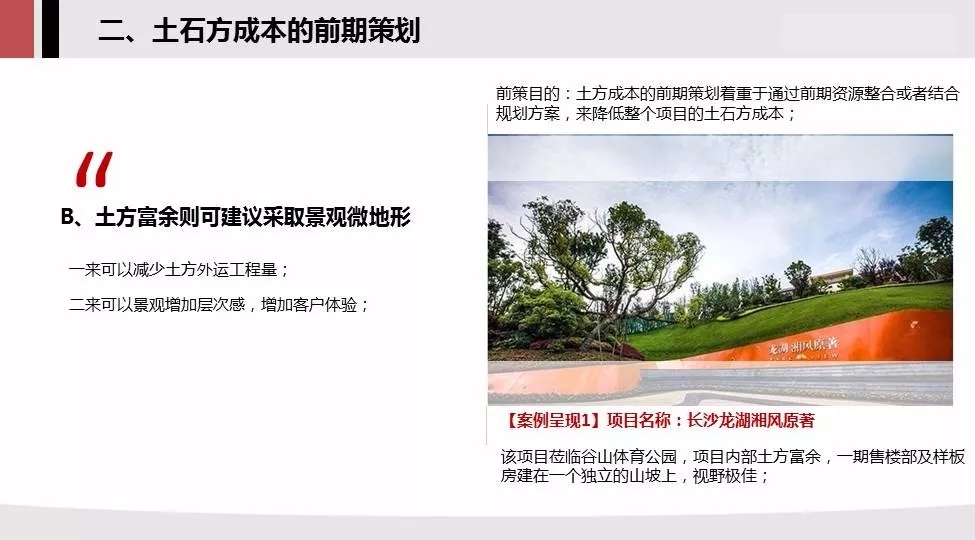 2.土石方的前期策划:调研土方稀缺情况相反的项目,土方富余可建议采用微地形,节地模式可大大节约土方成本,山体地块可做成坡地别墅;