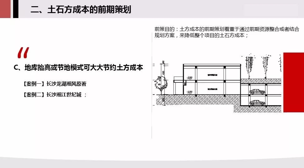 对于需要大量外运土方的项目,如果能够抬高地库或者采用节地模式,则可大大减少土方开挖成本。