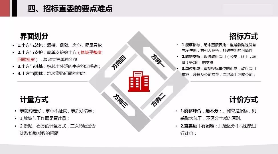 4.招标直委要点难点:招标方式,计价方式,计量方式,界面划分进行重点介绍;