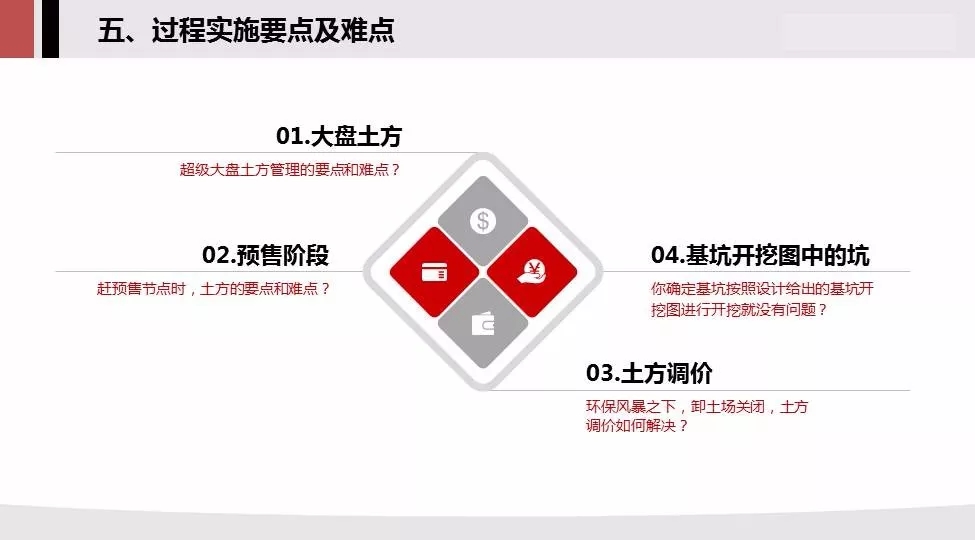 5.过程实施要点难点:大盘土方,预售阶段,土方调价,基坑开挖图中的坑一一说明;