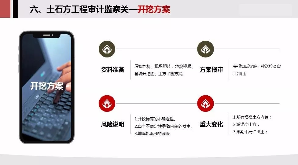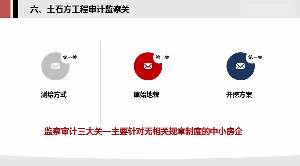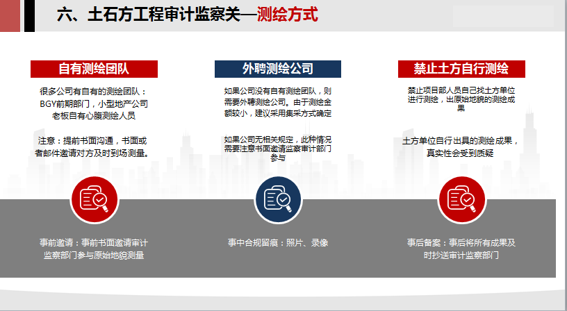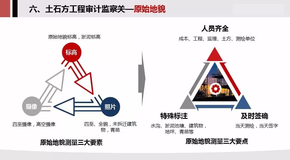 6.土石方监察审计关:测绘方式,原始地貌,开挖方案,阐述了三个方面的注意事项