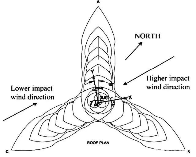 风洞试验项目包括:刚性模型力平衡试验、多自由度空气弹性模型研究、局部压力测量、行人风环境研究和风气候研究。其中刚性模型力平衡试验和多自由度空气弹性模型研究使用的模型比例是1∶500,行人风环境研究则使用了1∶250的模型。由于在气动弹性模型和力平衡试验结构中发现了雷诺数效应(尺寸效应),因此还在加拿大国家研究中心的9m9m的风洞中进行了高雷诺数测试,测试所用的模型尺寸为1∶50,风速可达55m/s(如图5)。在设计初期,采用高频天平测力技术进行风洞试验,以确定作用在哈利法塔主结构上的风荷载。采用风洞试验的数据与塔楼的动态特性相结合的方式,来计算哈利法塔的动态响应和整个建筑尺寸上的总的有效风力分布。最终以测力天平试验的结果用作哈利法塔早期结构设计时的输入参数,并且还用来进行哈利法塔刚度和质量分布变化时的参数研究。哈利法塔有六个主要的风向。其中三个风向正对着翼尖。风吹向翼尖时,每个翼部具有分流效果(见图6的翼A、翼B和翼C);另外三个方向是吹在两翼之间,称为尾向。可以发现:不同方向的风荷载谱显示,在重要的频率范围内,风对翼尖或鼻端的激振,比风对与之对应方向(尾向)的激振要小。在选择大楼方向与迪拜高频强风向和弱风向的相对关系时,设计时应格外注意。为比较大楼的几何形状与有关建筑结构方而改进的关系,进行几次天平试验。三个翼顺时针方向缩进,A翼首先缩进。在每一次风洞试验后,对数据进行分析,重新设计塔楼的形状以尽量降低风的影响。一般来说,缩进的次数和缩进的间距随着翼部形状的变化而改变。该调整过程是以扰乱风向的方式,使施加在塔楼上的风力大大减少。