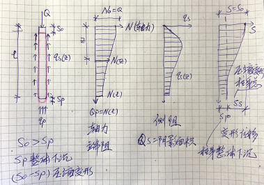 (2)当荷载增加到一定程度,桩深开始下沉,桩侧阻为动摩擦,桩端反力开始发挥作用。桩身受来自承台的轴力和围土的上拉力,轴力逐渐变小,桩身的压缩变形也逐渐变小。桩身对围土的相对变形包含桩整体下沉和桩身压缩变形,上部的变形总是大于下部,所以侧阻也是上部大于下部。见下图: