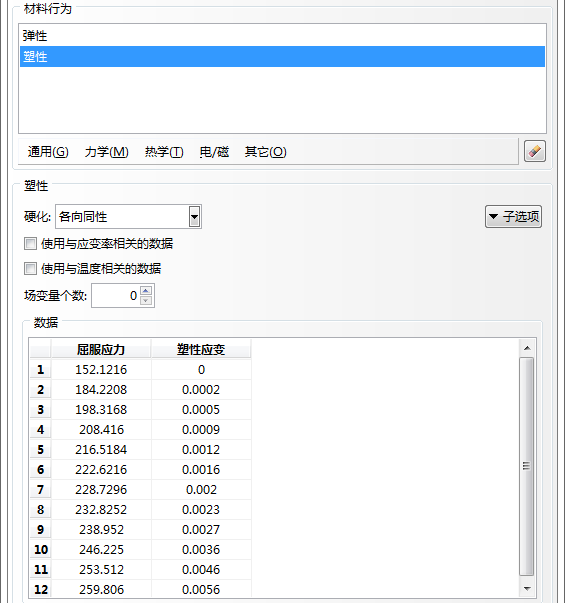 接下来给螺纹端头赋予截面属性,采用弹塑性本构,弹性模量取1.84e5MPa,泊松比0.3,对于材料塑性数据,一般试验测得是名义应力和名义应变,要将其转化成真实应力和真实应变输入软件中。