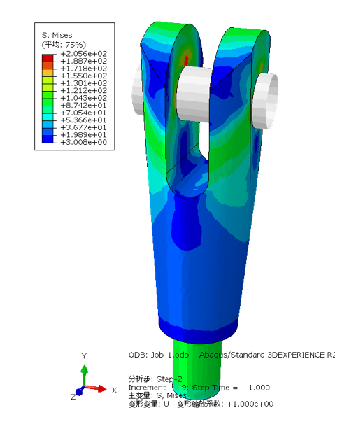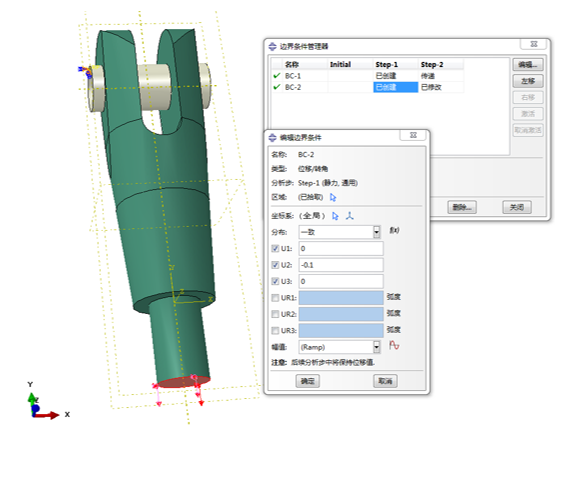 定义荷载和边界条件,首先在step-1中给销钉定义完全固定的边界条件,注意解析刚体只能定义在参考点上,同样在step-1中在拉杆端面施加0.1mm的轴向位移,如前所述是为了先确保两个接触面建立起平稳的接触关系;然后在step-2中将该位移解除,同时在拉杆端面施加100N/mm2的均布拉力,施加拉力时注意使用平滑的幅值曲线,以利于收敛。
