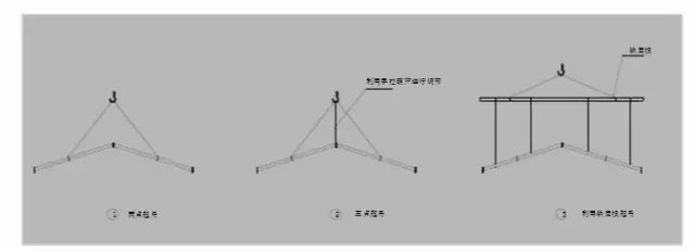 屋面梁的特点是跨度大(即构件长)侧向刚度很小,为了确保质量、安全、提高生产效率,减少劳动强度,根据现场条件和起重设备能力,最大限度地扩大地面拼装工作量,将地面组装好的屋面量吊起就位,并与柱连接。可选用单机两点或三点起吊或用铁扁担以减小索具所产生的对梁的压力。具体如下图: