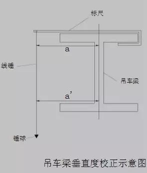 从吊车梁上翼缘挂锤球下来,测量线绳至梁腹板上下两处的水平距离,如下图,如a=a说明垂直,如aa,则可用铁楔进行调整。
