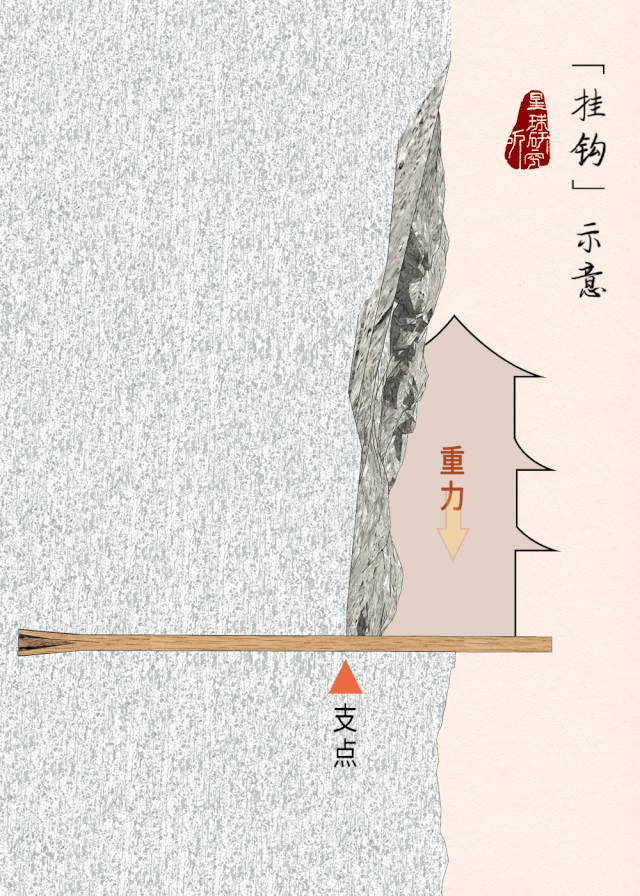 这些木材超过2/3的长度深入山体,以岩石平台为支点,每根可以承受数吨的重量,挂钩便制作完成了。