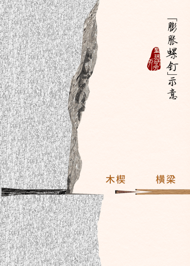 而挂钩本身也颇为奇妙,它选用质地坚硬的铁杉木并且用桐油长时间浸泡防腐防潮最神奇的是木材的一头预先打上了楔子当这些木材插入石孔楔子便会将木材撑开恰好卡在内大外小的石孔内等同于现代的膨胀螺钉。