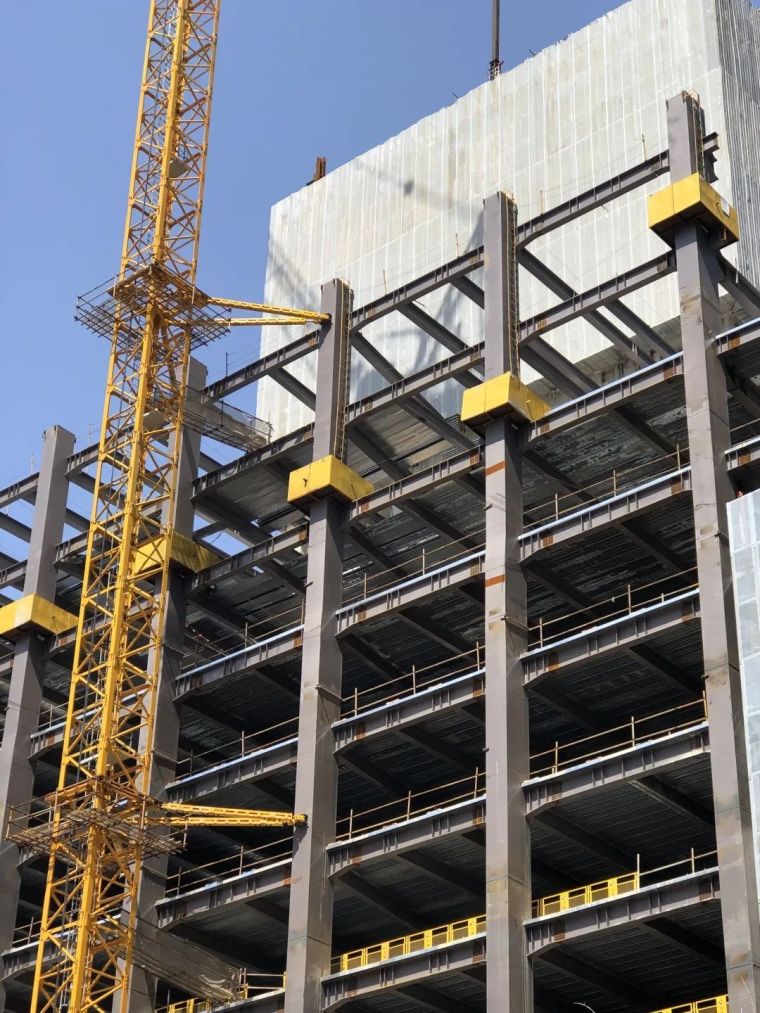 型钢混凝土柱,施工时,周边框架钢梁和楼面梁首先与柱内型钢安装连接,然后完成钢筋绑扎,浇筑混凝土将型钢包裹。因此钢骨混凝土梁柱节点处,钢筋配置较为复杂,但外包混凝土可提高结构耐久性,并具有天然防火和抗腐蚀的特点。