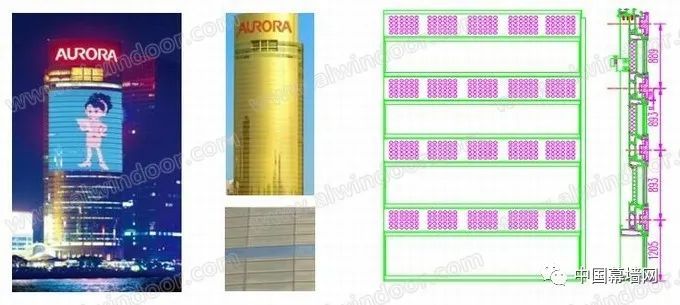 该横滑单元幕墙横竖龙骨采用双腔式设计,形成等压原理防水体系,进入前腔的少量水和进入后腔的极少量水可通过设在下一层单元前端的披水板(见图中不锈钢披水板)排出幕墙外面。该工程幕墙实现了一级高水密性,同时首次创造性地把LED显示模块与单元幕墙构造进行集成设计。大楼正面15层楼采用LED显示镶嵌模块,每个单元采用衬有金色镜面不锈钢板的四条长条显示模块,实现立面效果的统一(如下图)。
