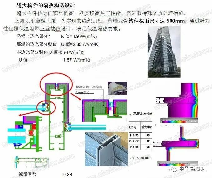 提高幕墙的保温、隔热性能,可以通过提高组成幕墙的玻璃等面板、型材、保温材料和玻璃与框之间衬垫材料构件的相关热阻,例如单玻璃改为中空玻璃、中空玻璃改用双中空或多层化、采用高性能多银Low-E膜,或幕墙体系采用多层组合构造,例如采用双层幕墙、外设遮阳百叶等,或采用能动态控制,例如电致变玻璃构件、智能控制遮阳百叶等。无论采用哪种策略,其龙骨断热方式、面板热特性和保温材料选择决定其热工性能。